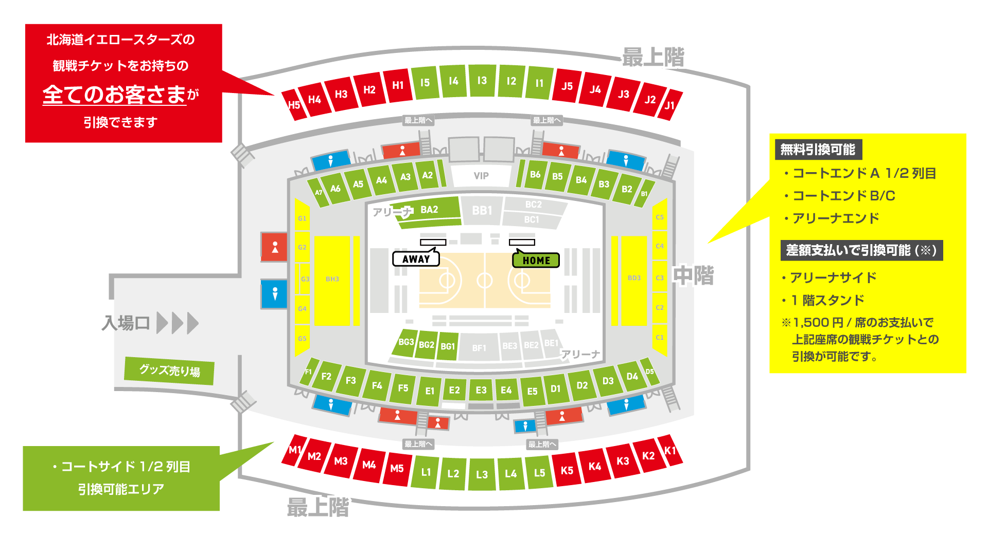 北海道イエロースターズの観戦チケットをお持ちのお客さまは、チケット種別に関わらず、レバンガ北海道の試合時に『最上階(2F) J・K・H・Mブロック』での観戦が可能です。
