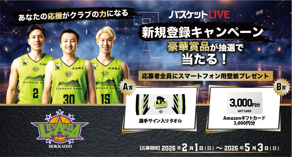 このたび、シーズンも後半戦に突入し、さらに熱い試合が続くこの時期に『バスケットLIVE 新規登録キャンペーン』を実施いたします!