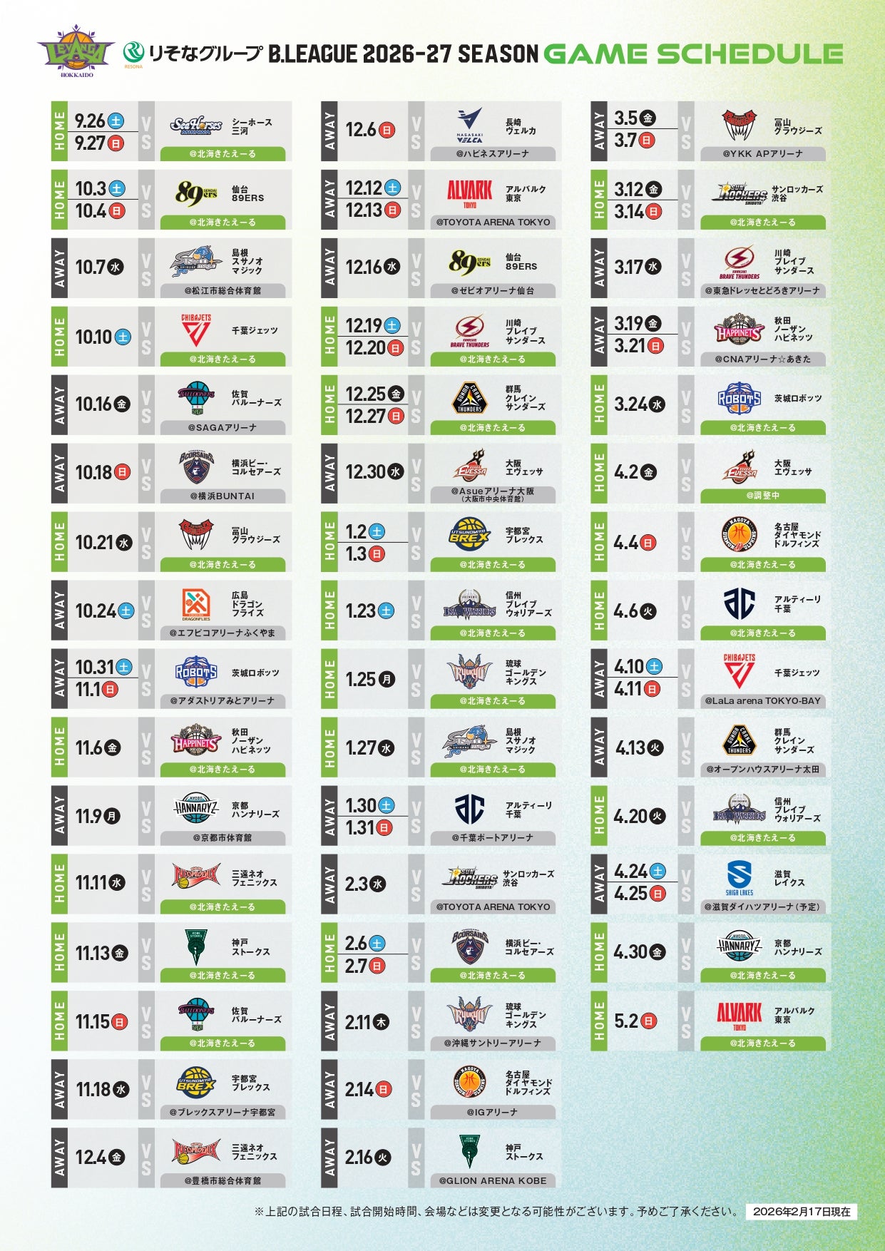 りそなグループ B.LEAGUE 2026-27 SEASON レバンガ北海道全試合日程のお知らせ