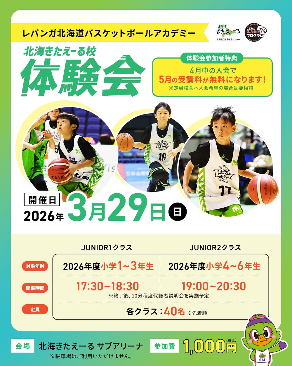 このたび、レバンガ北海道バスケットボールアカデミーでは、「北海きたえーる校 体験会」を開催いたします。