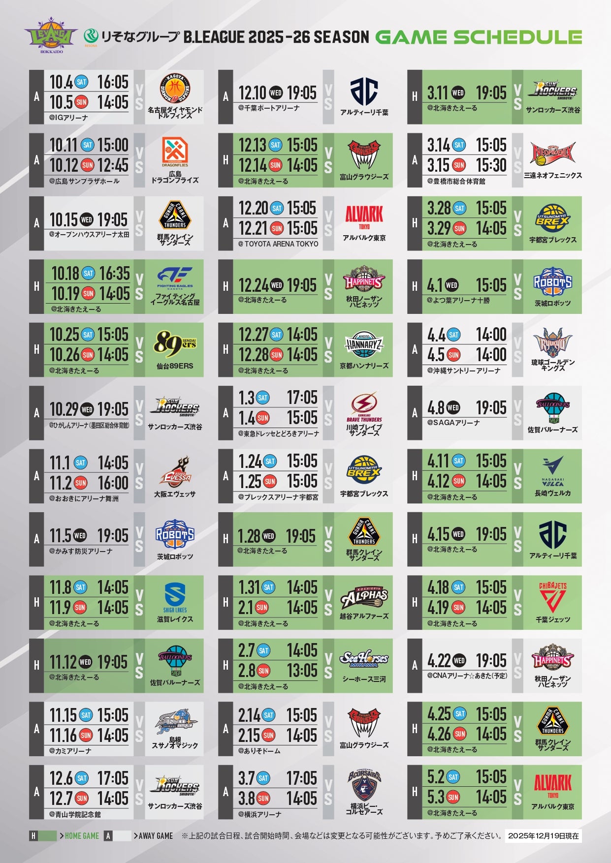 りそなグループ B.LEAGUE 2025-26 SEASON レバンガ北海道レギュラーシーズン全試合日程のお知らせ